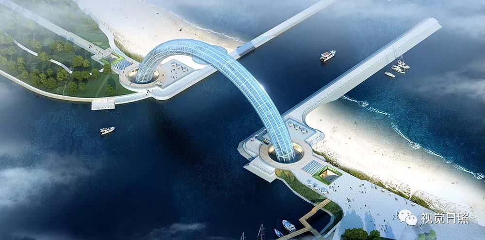 遠(yuǎn)觀大橋,彩虹形橋體呼應(yīng)“日出初光先照”之意,如一輪剛剛升起的紅日坐落在海平面上,在每天日出之時(shí),橋體與自身倒影相映成趣,以初升之日點(diǎn)睛,形成壯美的巨目形象。