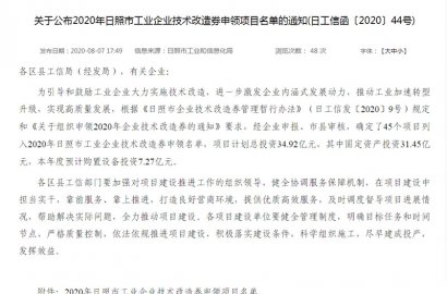 根據(jù)《日照市企業(yè)技術改造券管理暫行辦法》(日工信發(fā)〔2020〕9號)規(guī)定和《關于組織申領2020年企業(yè)技術改造券的通知》要求,經(jīng)積極申報,通過市工業(yè)和信息化局審核,成功申領2020年日照市工業(yè)企業(yè)技術改造券。
