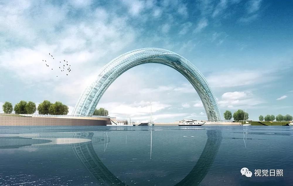 遠(yuǎn)觀大橋,彩虹形橋體呼應(yīng)“日出初光先照”之意,如一輪剛剛升起的紅日坐落在海平面上,在每天日出之時(shí),橋體與自身倒影相映成趣,以初升之日點(diǎn)睛,形成壯美的巨目形象。